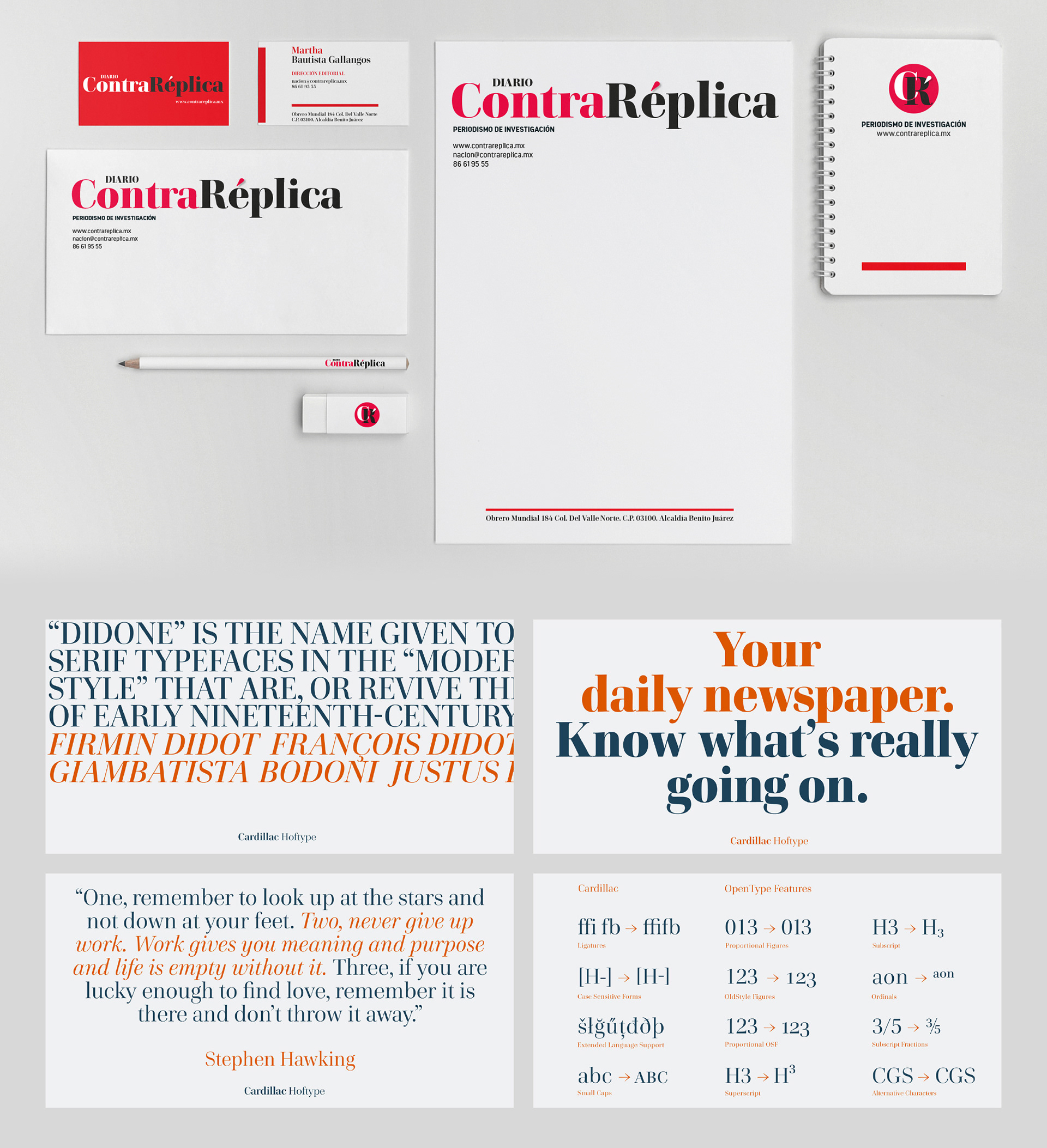 Tipografía. La familia tipográfica Cardillac consta de 14 estilos y ofrece numerosas características que la hacen ideal para aplicaciones ambiciosas. Su claridad, apariencia noble y elegancia la hacen perfecta para su uso en revistas y periódicos. Está disponible en formato OpenType y ofrece soporte de idiomas extendido.